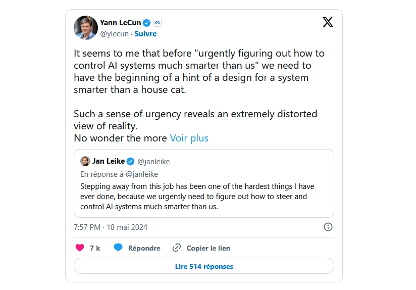 Mais ces modèles ont souvent été critiqués par Yann LeCun, qui les juge limités. « Il me semble qu’avant de trouver d’urgence comment contrôler des systèmes d’IA beaucoup plus intelligents que nous, nous devons avoir le début d’une ébauche de conception d’un système plus inteligent qu’un chat domestique », a par exemple écrit le directeur scientifique pour l’IA chez Meta sur X en mai 2024.