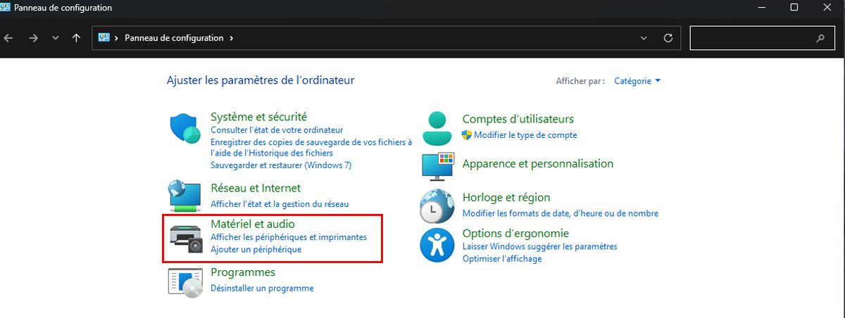 - Ouvrez le Panneau de configuration, puis cherchez l’onglet Matériel et audio