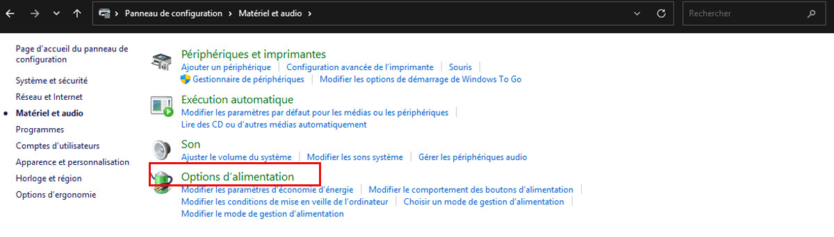 Maintenant, vous devriez être en mesure de pouvoir sélectionner le mode Performances optimales depuis le Panneau de configuration, toujours dans l’onglet Matériel et Audio > Options d’alimentation.