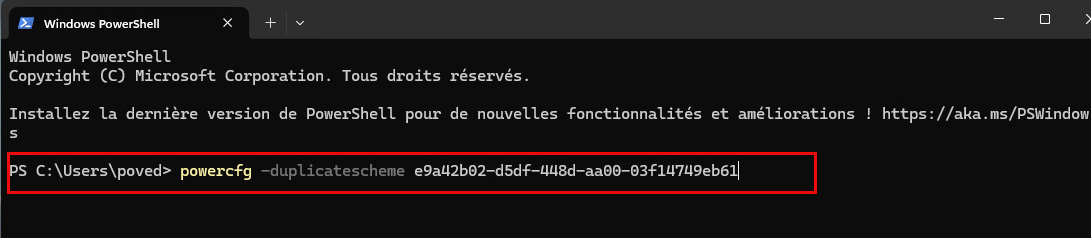 - Saisissez cette ligne de commande : powercfg -duplicatescheme e9a42b02-d5df-448d-aa00-03f14749eb61