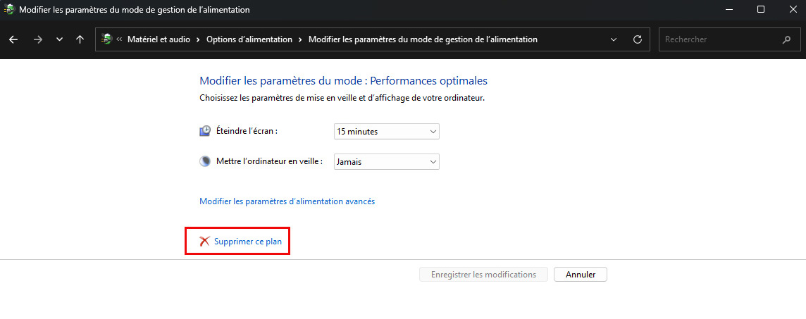 D’ailleurs, vous pouvez le désactiver quand vous le souhaitez dans les options d’alimentations en cliquant sur Modifier les paramètres du mode > Supprimer le plan.
